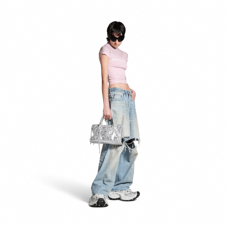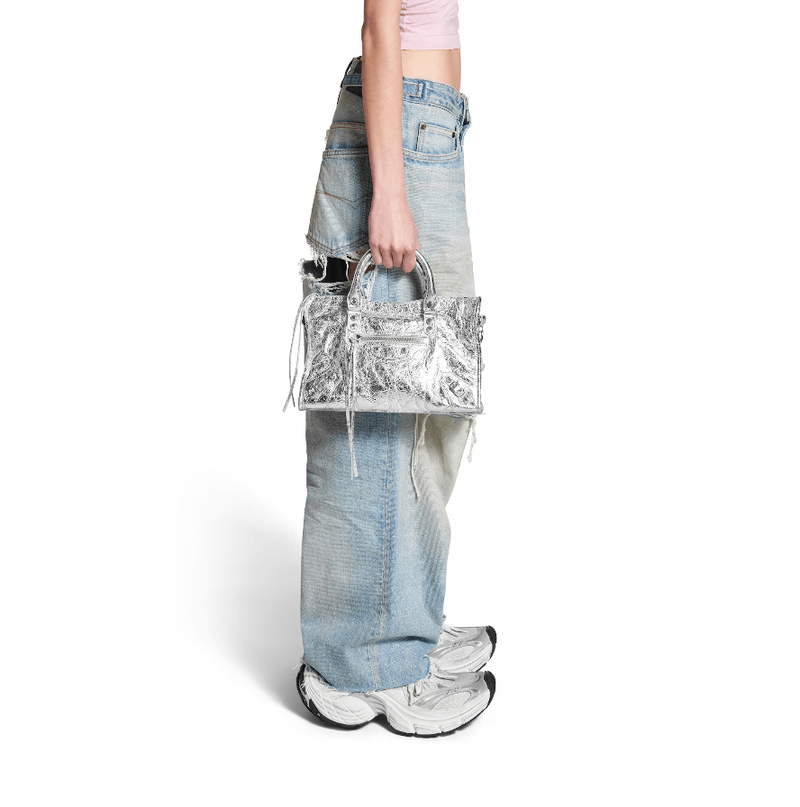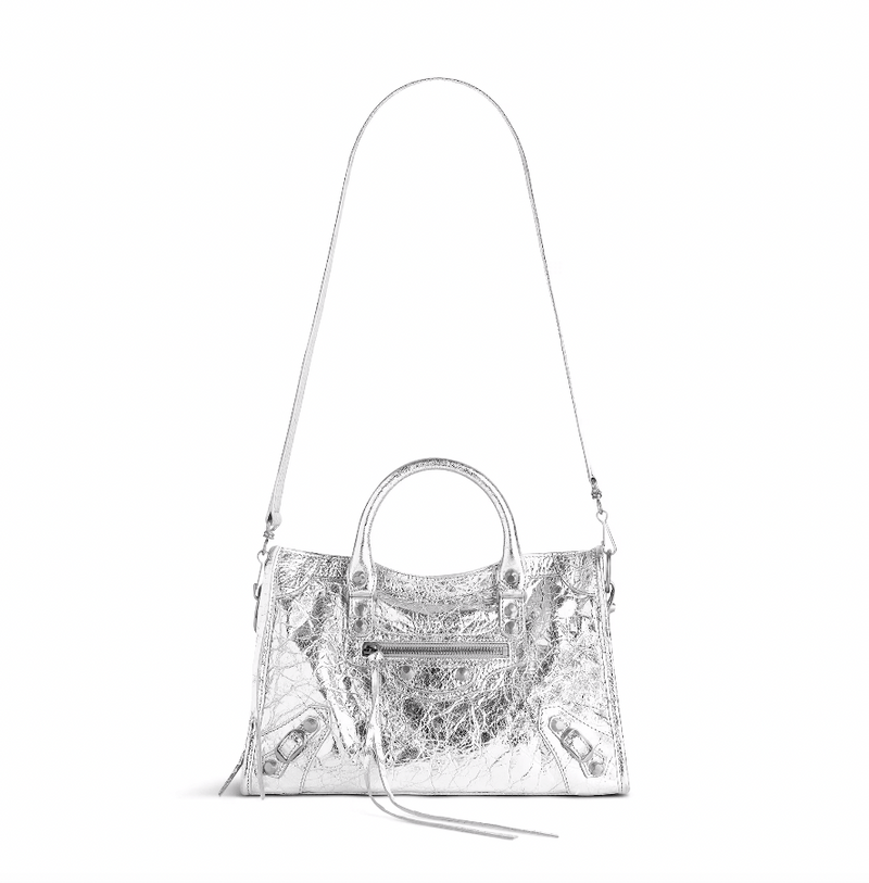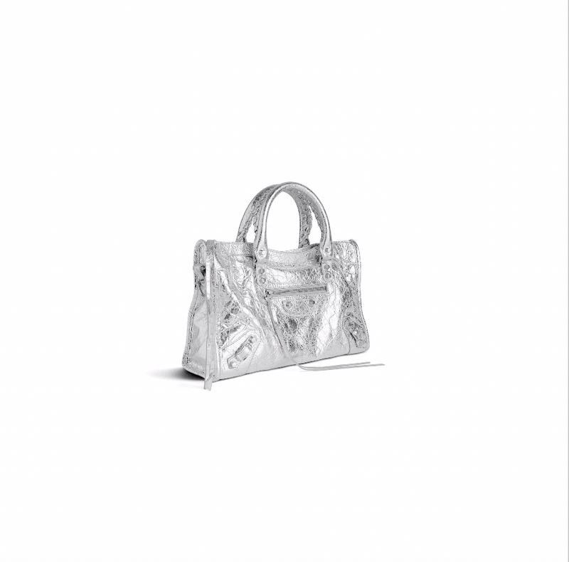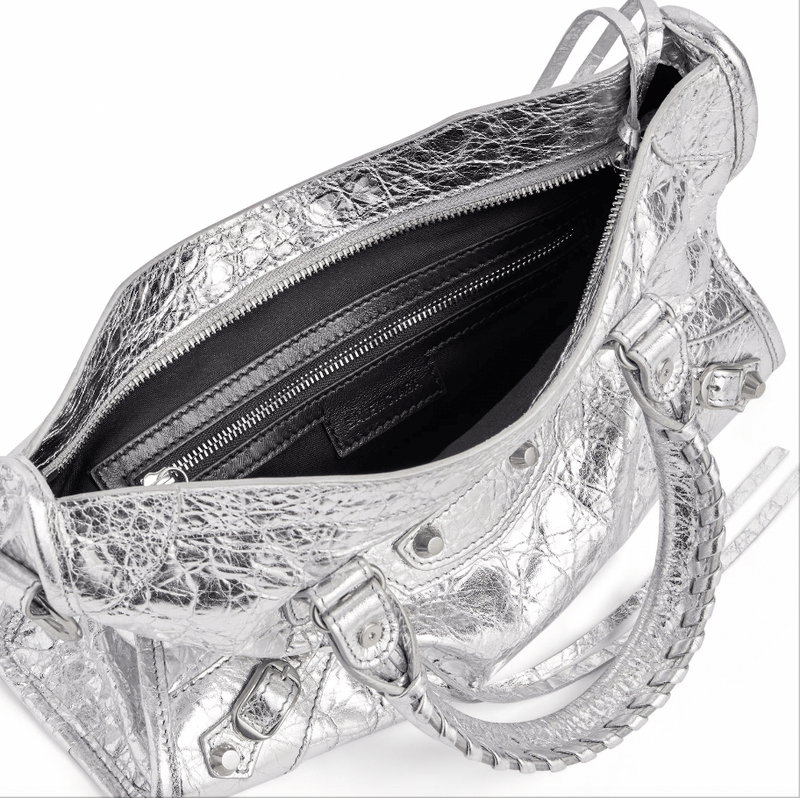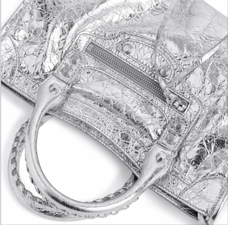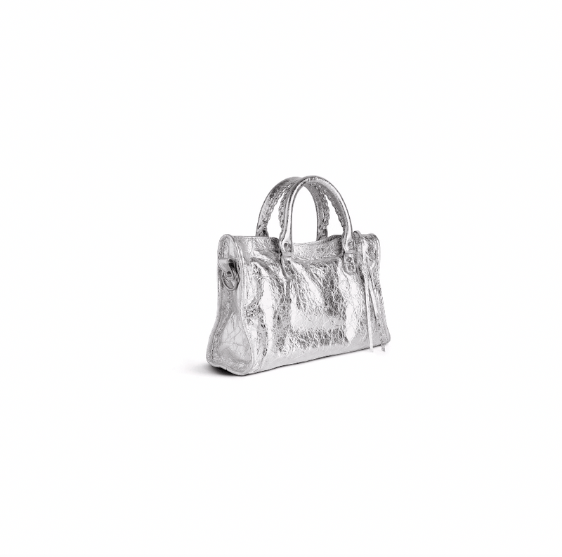 Sac Le City Petit en cuir d'agneau Arena métallisé argenté avec finitions coloris argent brillant